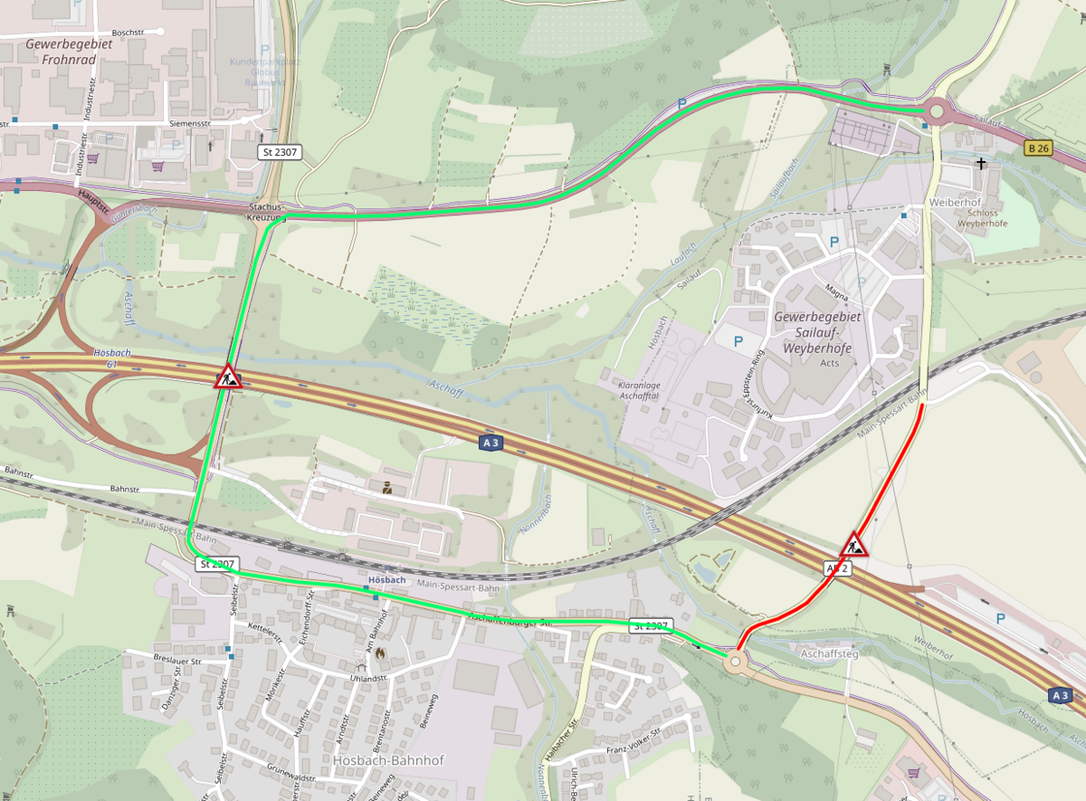 Der Verkehr wird in dieser Zeit umgeleitet auf die Aschaffenburger Straße St 2307 in Hösbach-Bahnhof und dann über die Stachus-Kreuzung auf die Bundesstraße B 26 nach Sailauf. Auf Grund der höhenbeschränkten Bahnbrücke auf dieser Strecke werden LKW stattdessen über die Autobahn A 3 umgeleitet. Die Zufahrt nach Steiger bleibt während der Bauarbeiten möglich - zunächst von den Weyberhöfen kommend und im weiteren Verlauf der Arbeiten dann von Hösbach-Bahnhof kommend.