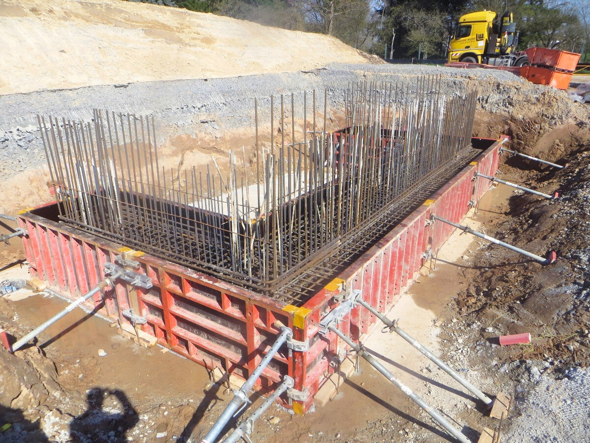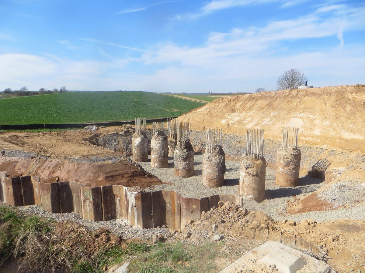 Im März konnten die Arbeiten an den drei Brückenbauwerken über den Mühlbach, über den Pflaumbach sowie zur Überführung des landwirtschaftlichen Verkehrs auf Höhe des Gipfelkreuzes fortschreiten. Nachdem die Pfahlgründungen für die Brücke über den Pflaumbach fertig gestellt waren, wurde dort im März ein Baukran aufgestellt. Derzeit werden auf diesen Gründungen bereits die Pfahlkopfbalken betoniert. Parallel laufen bereits die Vorbereitungen zur Ausführung der gleichen Betonarbeiten zur Erstellung der Pfahlkopfbalken an der Brücke über den Mühlbach. Für die Überführung auf Höhe des Gipfelkreuzes konnte im März die Baugrube fertig ausgehoben werden, so dass mit den Pfahlgründungen begonnen werden konnte. Sobald diese fertig gestellt sein werden, sollen auch darauf die Pfahlkopfbalken betoniert werden. Um die Standsicherheit der Brücken sicher zu stellen, waren Bohrpfähle erstellt worden, die mit einem Durchmesser von bis zu einem Meter rund 15 Meter bis 20 Meter in die Erde ragen.